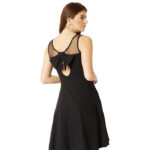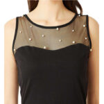 Black knitted cotton solid sheer and pearl detailing mini skater dress, Has a round neck and is sleeveless, Has a bow detailing at the back and a zip closure, Product Measurement -XS: Bust-31 Waist-24.5 Hip-35 -S: Bust-33 Waist-26.5 Hip-37 -M: Bust-35 Waist-28.5 Hip-39 -L: Bust-37 Waist-30.5 Hip-42 -XL: Bust-39 Waist-32.5 Hip-43