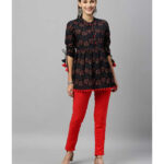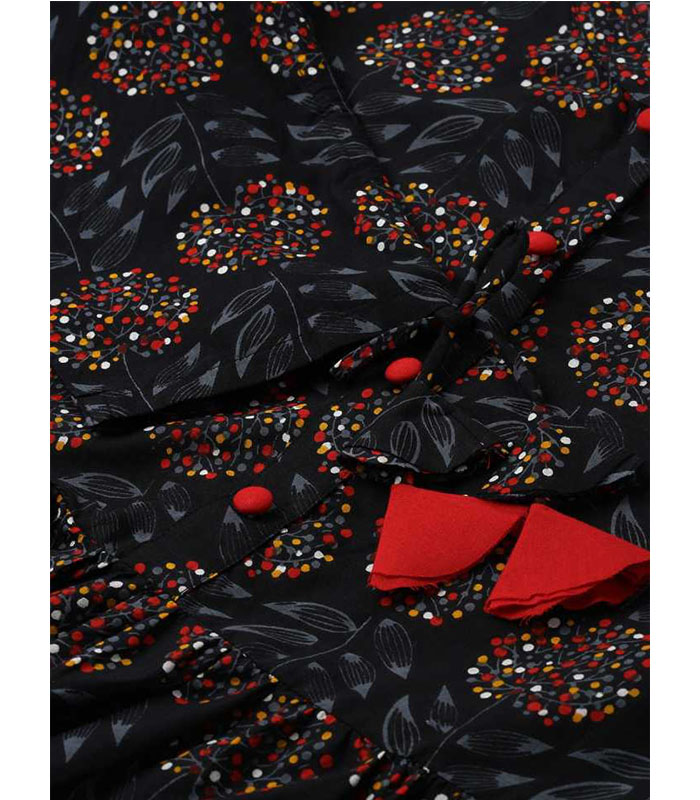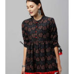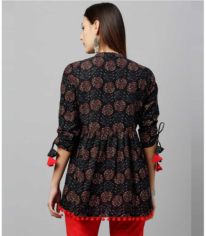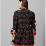 An amazing range of women’s western wear in soft and solid colors that looks perfect for regular wear. With beautiful designs and patterns. These apparels are very stylish and comfortable too. Get rid of the ‘regular’ look this season wearing Top/Shirt. With a perfect blend of comfort and western style, This Black Floral Print Regular Wear Top from exhibits fabric button attached on neck line with loops on sleeves, pompam lace attached on button along with Mandarin collar & 3/4th Sleeves. Tailored from Cotton. Product Length: 28 Inches.