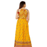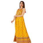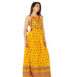Comfortable Long Dress Jaipuri Printed in Rayon Fabric For Parties, Festivals and for wedding occasions even works fabulous in Clubs parties.